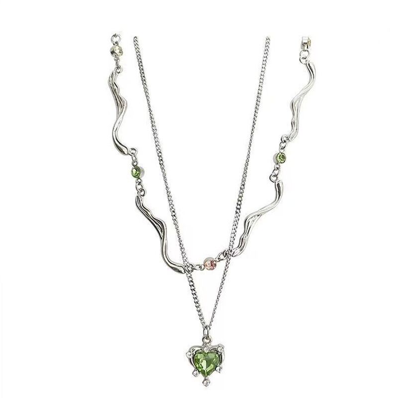 2連 ウェーブ グリーン ハート ラインストーン チェーン ネックレス レディース