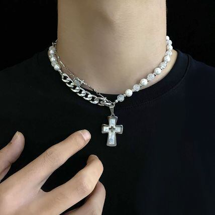 パール クロス ネックレス ユニセックス シルバー チョーカー ショート チェーン