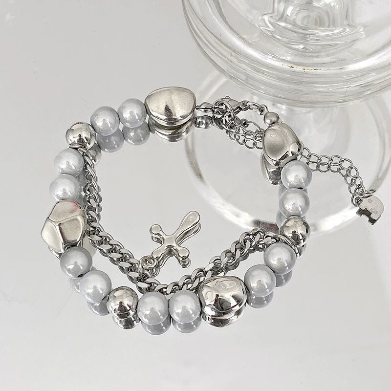2連 十字架 チェーン リフレクティブ パール ブレスレット ユニセックス