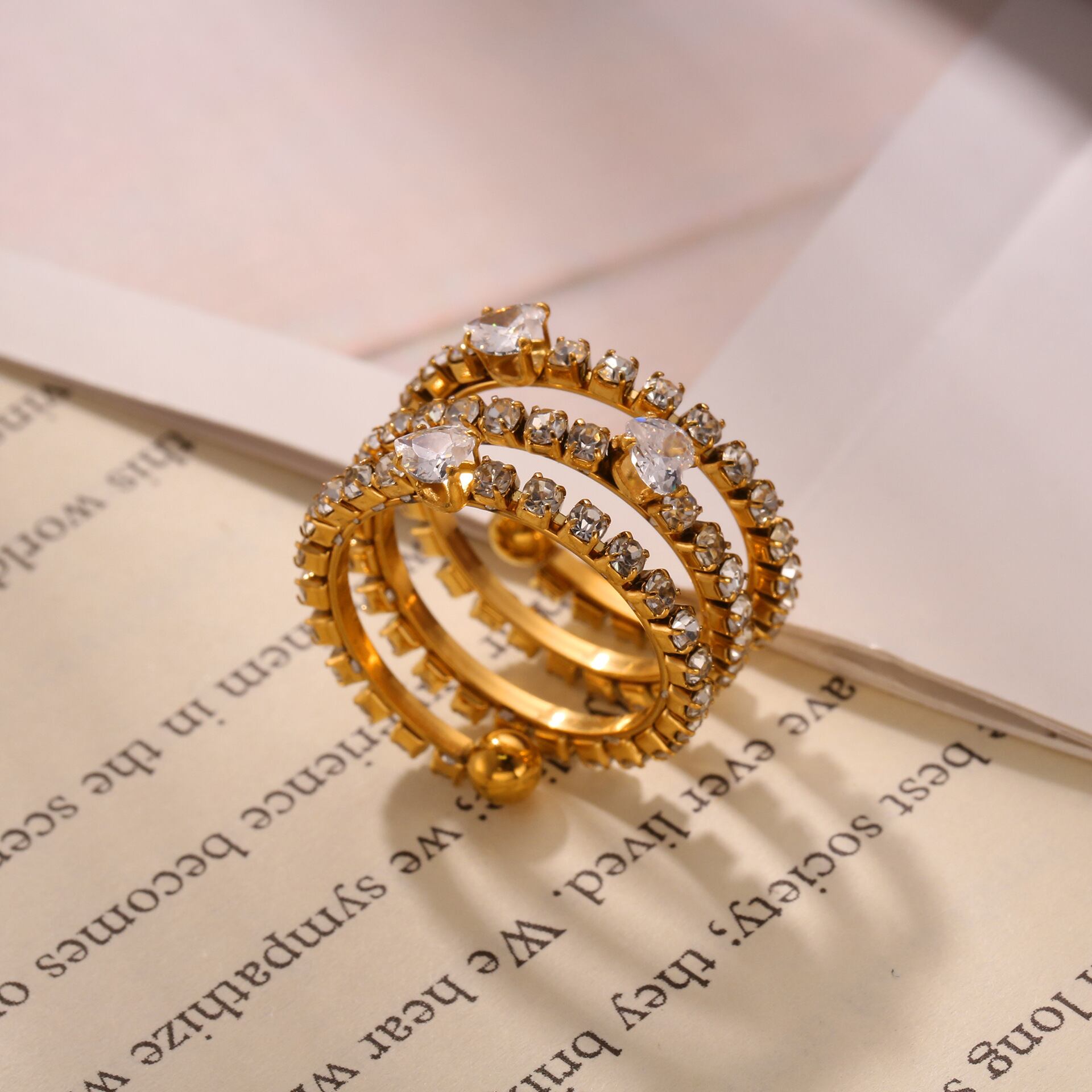 キュービックジルコニアが散りばめられた3連風デザインで、指元に華やかさと洗練された印象を与えます。