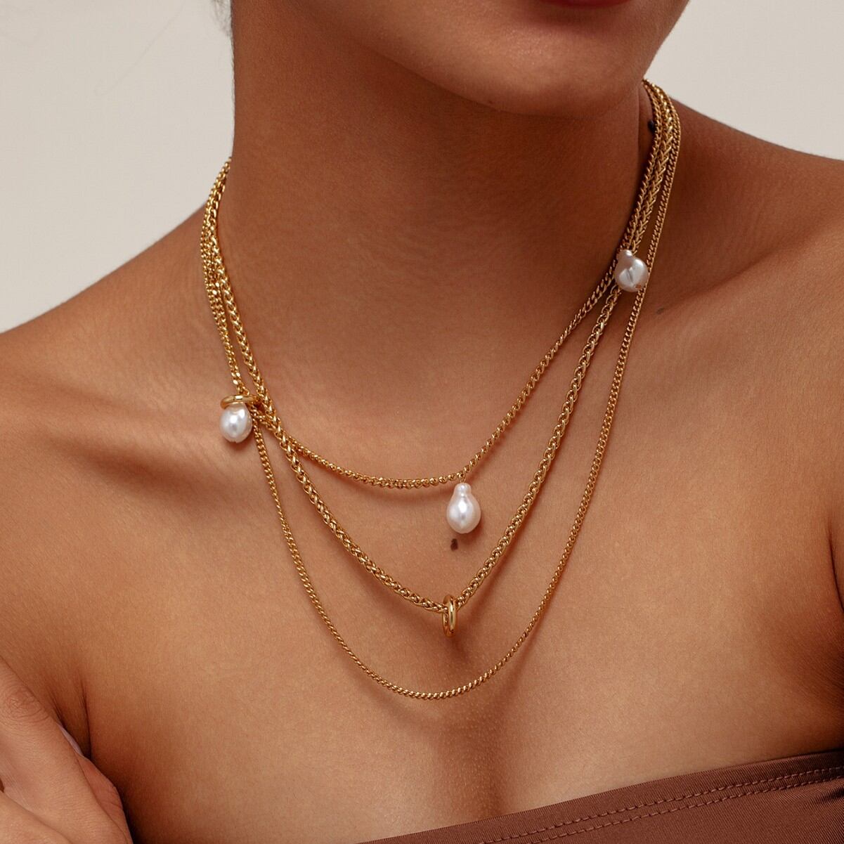 異なる長さのチェーンが首元に立体感を与え、中央には上品なパールペンダントが揺れて輝きを添えます。