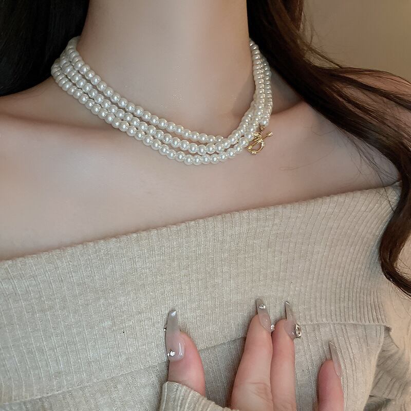 ヴィンテージテイストのパールをあしらった多層重ね付けネックレスです。